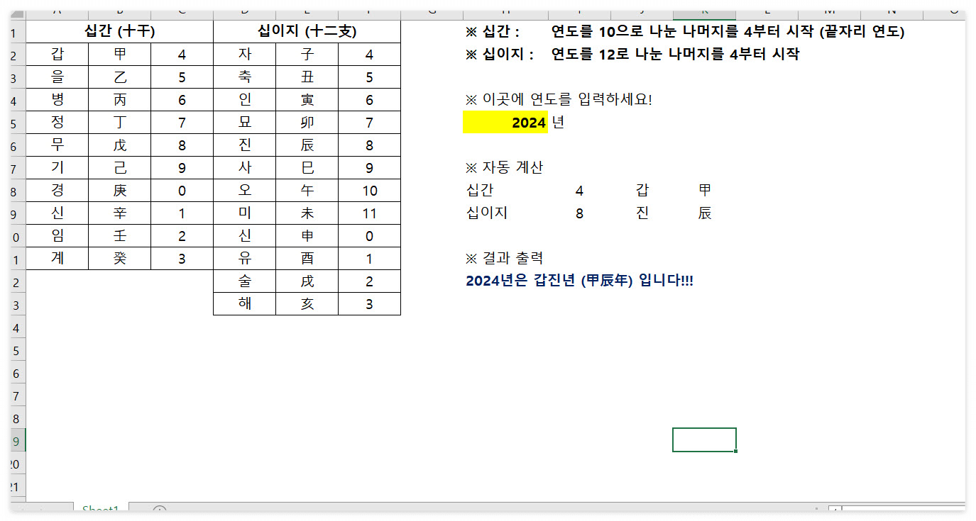 이 계산기 하나 갖고 계시면 매년 무슨 해인지, 내가 태어난 해가 육십갑자로 무슨 해였는지 확인하실 수 있고, 엑셀 실력도 향상되실 것입니다.