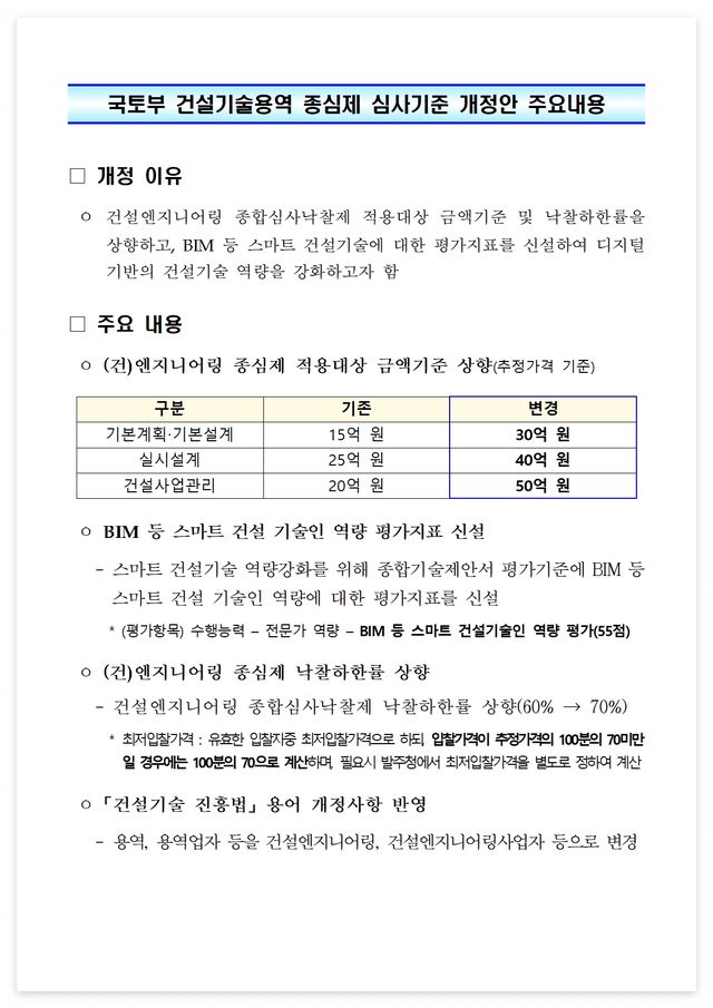 ㅇ 건설엔지니어링 종합심사낙찰제 적용대상 금액기준 및 낙찰하한률을 상향하고, BIM 등 스마트 건설기술에 대한 평가지표를 신설하여 디지털 기반의 건설기술 역량을 강화하고자 함