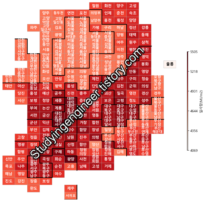 이때 파이썬 책 (파이썬으로 데이터 주무르기)을 하나 사서 공부하던 중 대선 결과를 지도로 만드는 과정을 예제로 접하고 나서 찾아 헤매던 길을 찾았습니다. 일단 데이터만 있으면 시각적으로 결과를 도출할 수 있는 방법을 본 것입니다. 그래서 일단 시각화는 됐고 데이터를 모두 모아 지자체별로 정리하는 방법을 공부한 뒤 결국 개발하는데 성공하게 됩니다. 파이썬을 공부한지 4개월 정도 되었을 때 아래와 같은 햇빛지도를 만들었고 매년 업데이트를 하고 있습니다.