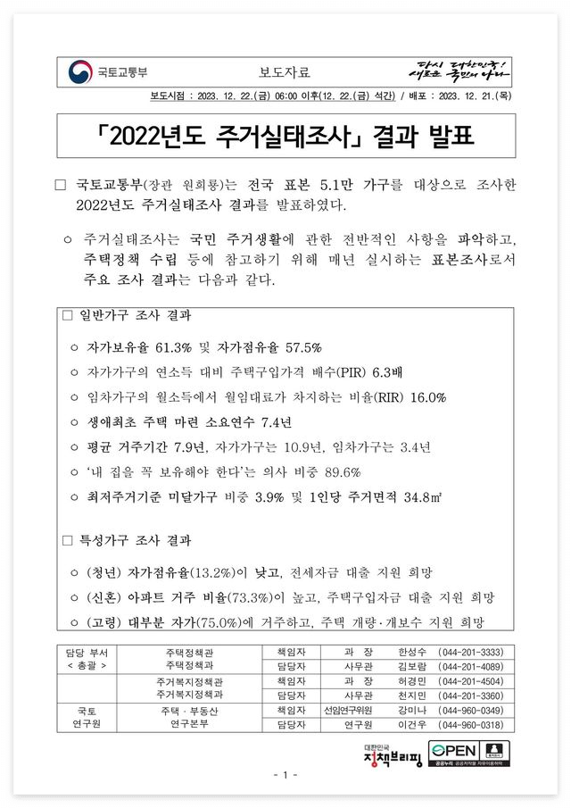 □ 제목 : 2022년도 주거실태조사 결과 발표