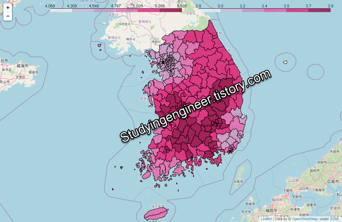 이때 파이썬 책 (파이썬으로 데이터 주무르기)을 하나 사서 공부하던 중 대선 결과를 지도로 만드는 과정을 예제로 접하고 나서 찾아 헤매던 길을 찾았습니다. 일단 데이터만 있으면 시각적으로 결과를 도출할 수 있는 방법을 본 것입니다. 그래서 일단 시각화는 됐고 데이터를 모두 모아 지자체별로 정리하는 방법을 공부한 뒤 결국 개발하는데 성공하게 됩니다. 파이썬을 공부한지 4개월 정도 되었을 때 아래와 같은 햇빛지도를 만들었고 매년 업데이트를 하고 있습니다.
