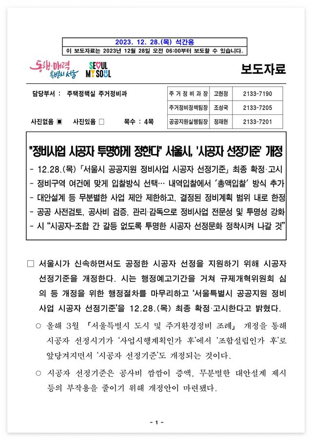 - 12.28.(목)「서울시 공공지원 정비사업 시공자 선정기준」최종 확정‧고시