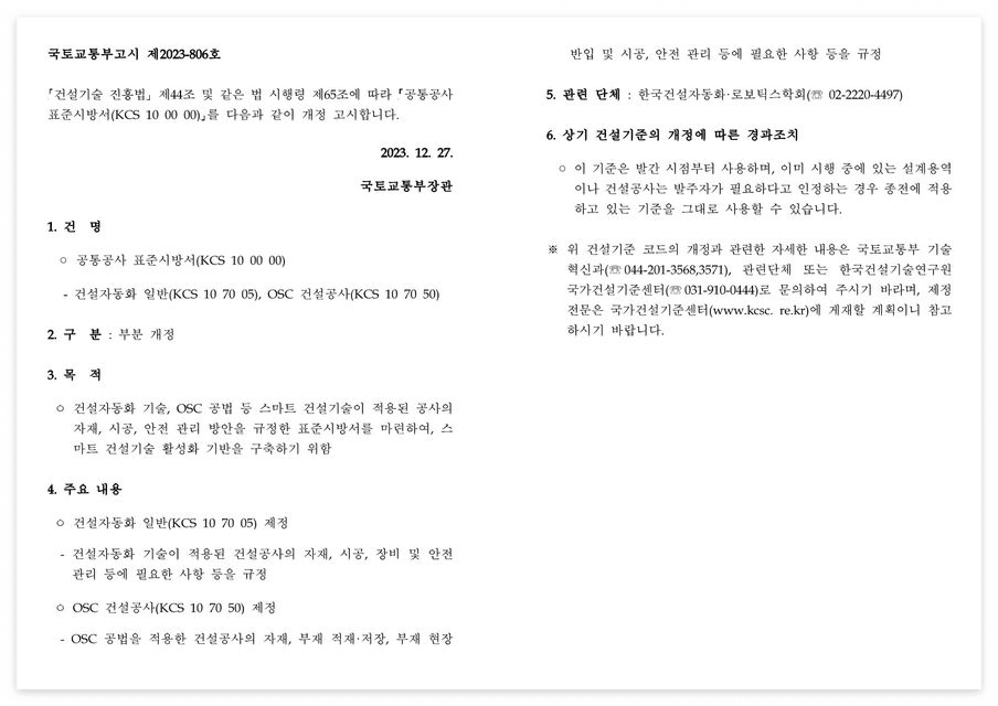 □ 제목 : 건설자동화 일반(KCS 10 70 05), OSC 건설공사(KCS 10 70 50) 표준시방서 제정