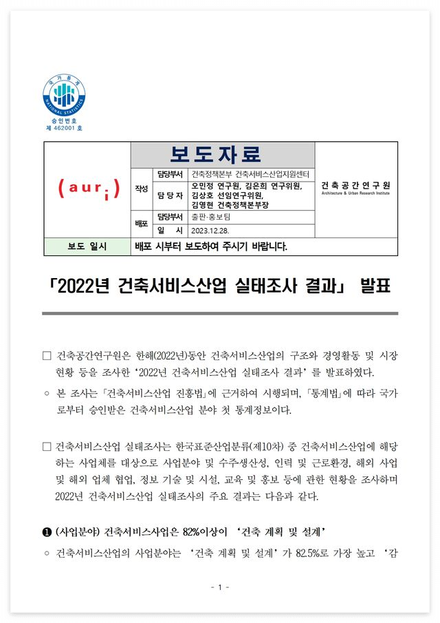 □ 자료 다운로드 : [건축공간연구원-보도자료] 2022년 건축서비스산업 실태조사 결과 발표_수정