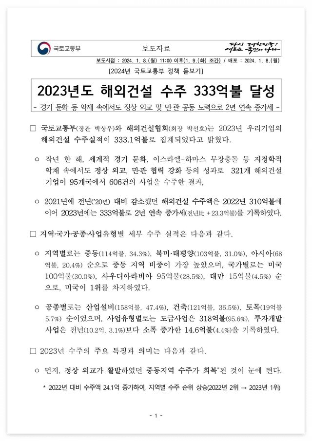 □ 자료 다운로드 : 240109(조간) 2023년도 해외건설 수주 333억불 달성(해외건설정책과)