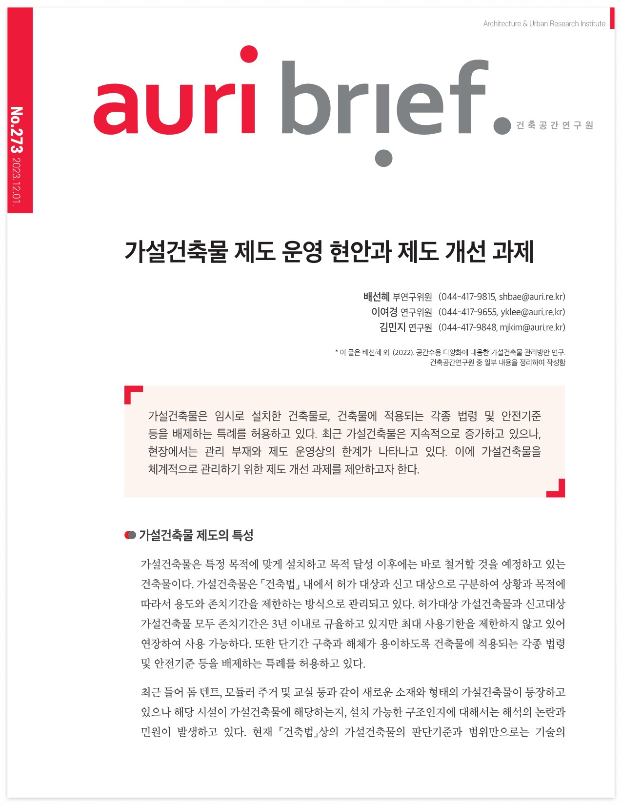 □ 자료 다운로드 : 273호_가설건축물 제도 운영 현안과 제도 개선 과제(배선혜, 이여경, 김민지)