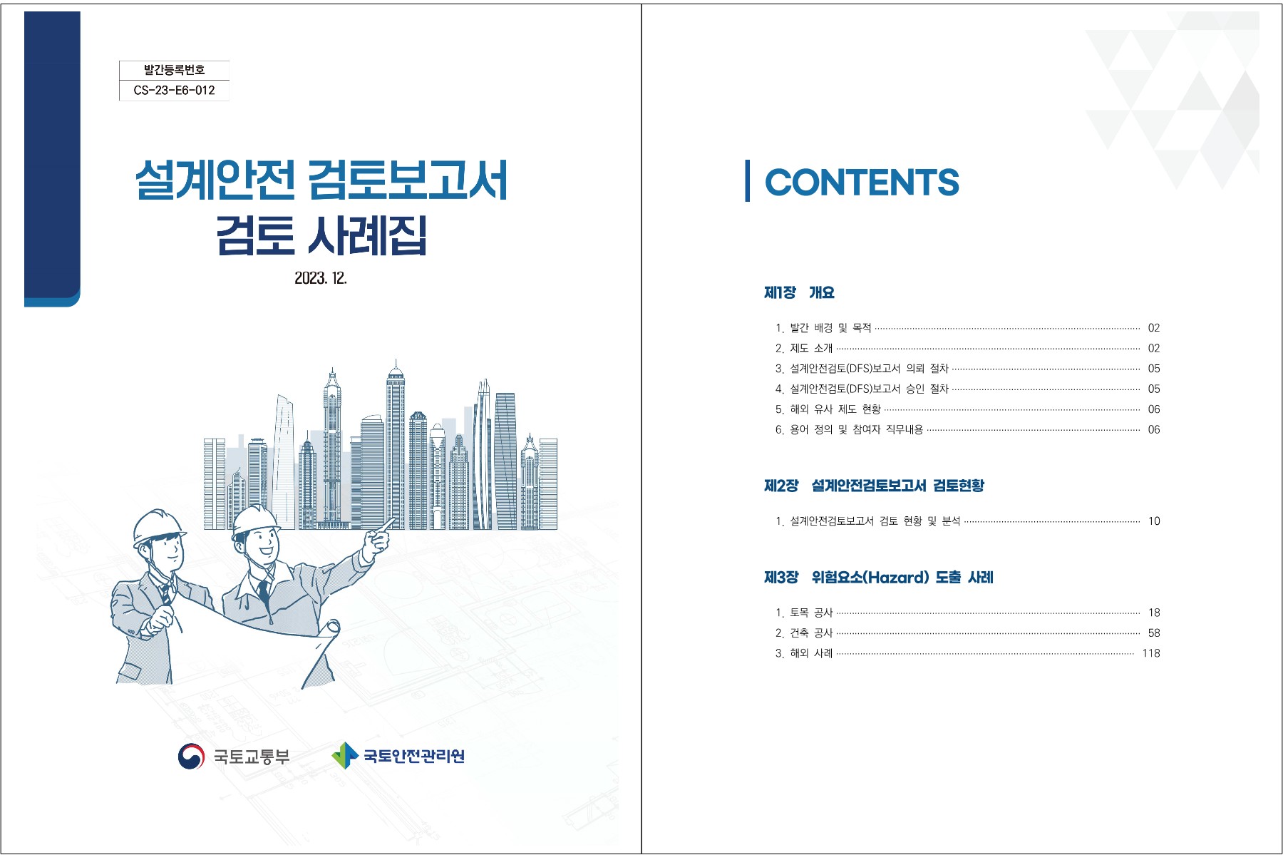 2023년 6월까지 발주청에서 검토의뢰 받은 보고서에 대해 국토안전관리원에서 검토한 결과 설계단계에서 발굴한 해당 건설공사의 위험요소 및 저감대책이 제도 시행 목적을 만족하지 못하는 사례가 반복적으로 발견되고 설계사 및 발주청 담당자들이 보고서 작성에 많은 어려움을 겪고 있어 2017년부터 국토안전관리원이 수행한 설계안전검토보고서 검토 현황을 분석하고 보고서 작성 사례를 발췌・공유함으로써 설계안전검토보고서 작성 및 관련 업무에 실질적인 도움을 주고자 사례집을 발간하게 되었습니다.