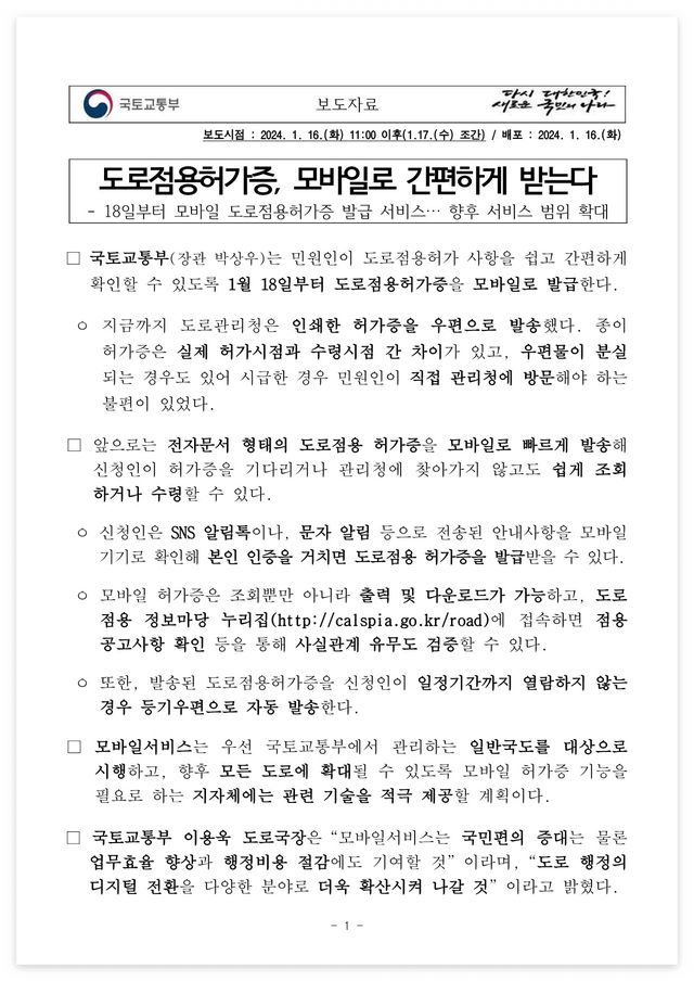 □ 국토교통부(장관 박상우)는 민원인이 도로점용허가 사항을 쉽고 간편하게 확인할 수 있도록 1월 18일부터 도로점용허가증을 모바일로 발급한다.