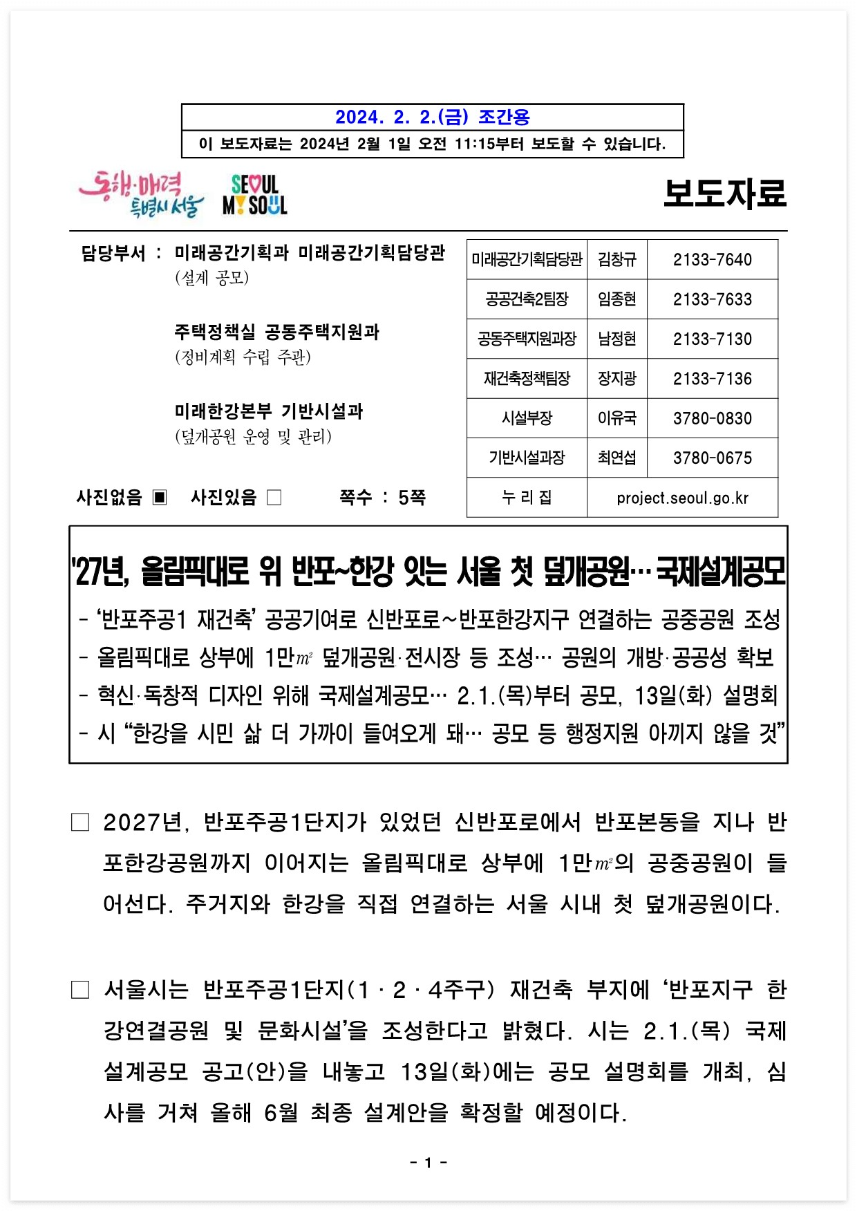 □ 자료 다운로드 : _27년, 올림픽대로 위 반포~한강 잇는 서울 첫 덮개공원… 국제설계공모