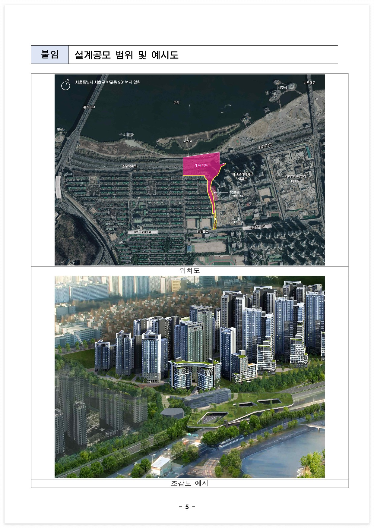 □ 그동안 서울시는 반포주공1단지(1․2․4주구) 재건축의 기부채납시설로서 ‘반포 한강연결공원’을 조성키로 하고 설계공모에 앞서 재건축 조합과 긴밀하게 협의해 왔으며, 앞으로 설계․시공 단계에도 공원의 개방성과 공공성, 혁신성 등을 확보하기 위해 상호 노력할 방침이다.