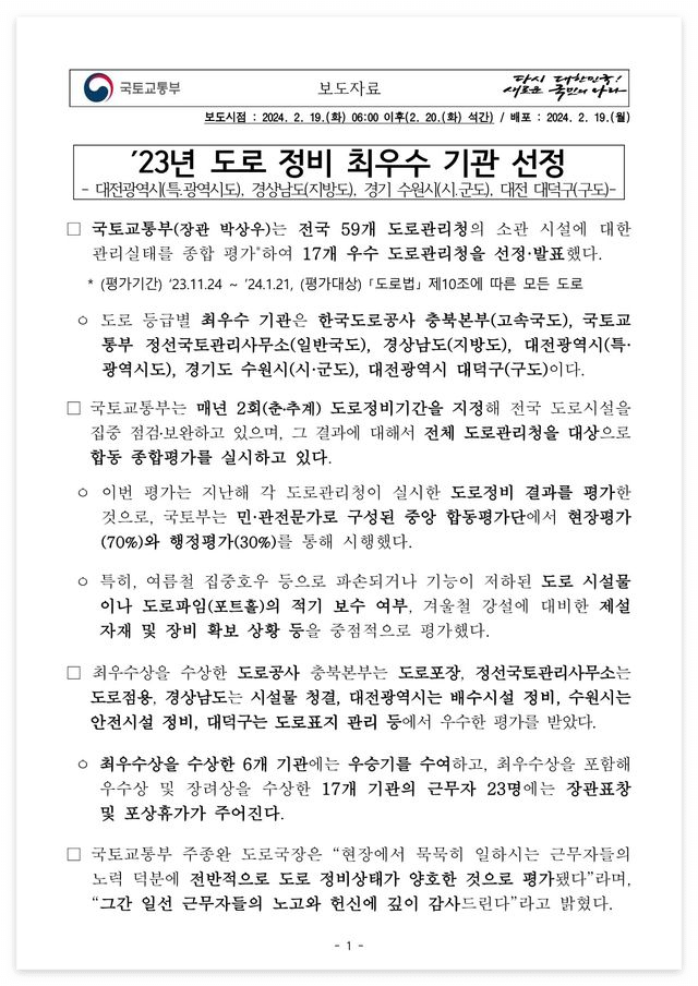 □ 자료 다운로드 : 240220(석간)_23년 도로 정비 최우수 기관 선정(도로관리과)