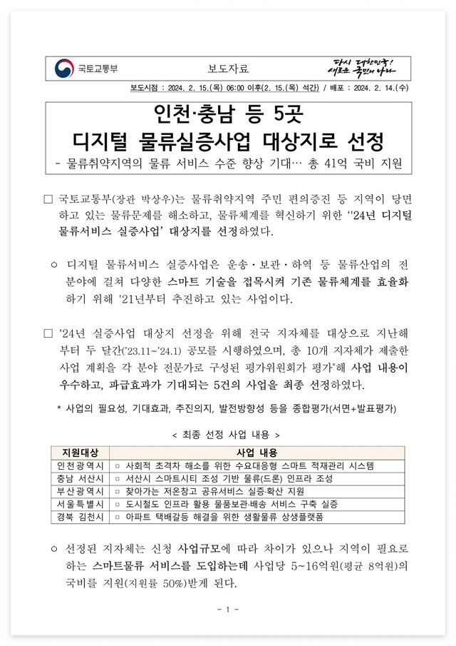 □국토교통부(장관 박상우)는 물류취약지역 주민 편의증진 등 지역이 당면하고 있는 물류문제를 해소하고, 물류체계를 혁신하기 위한 ‘'24년 디지털 물류서비스 실증사업’ 대상지를 선정하였다.