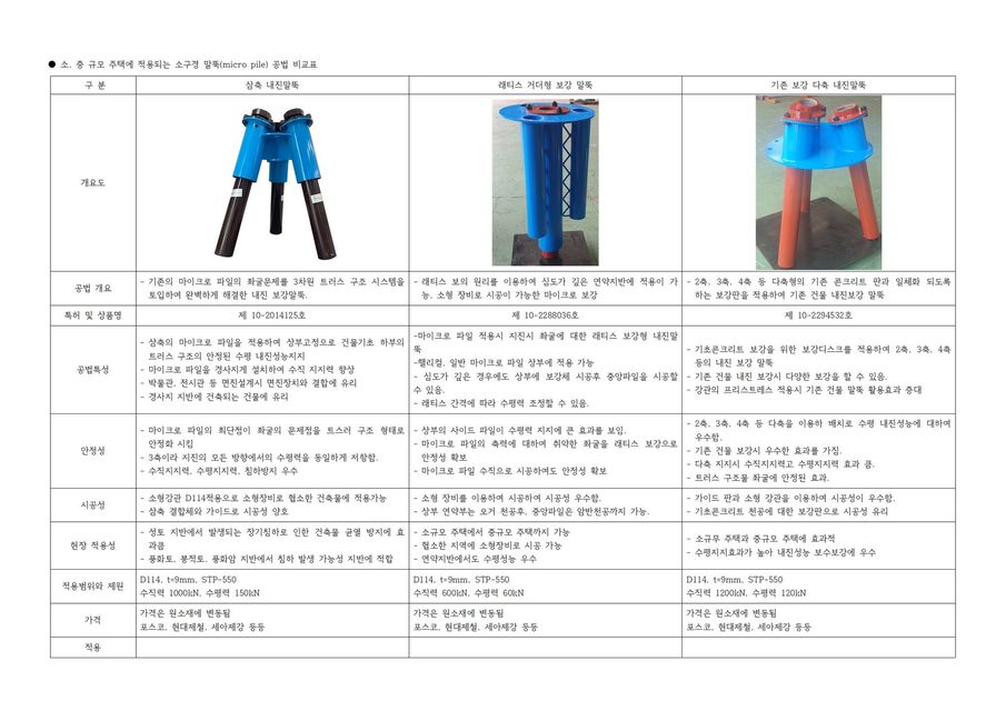 | 시공성 | - 소형강관 D114적용으로 소형장비로 협소한 건축물에 적용가능 - 삼축 결합체와 가이드로 시공성 양호 |