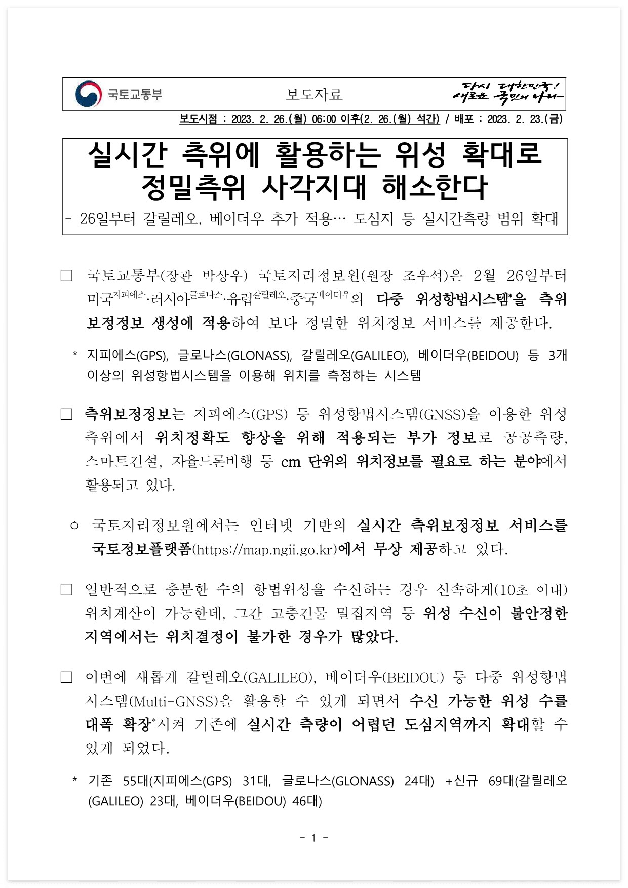 □ 국토교통부(장관 박상우) 국토지리정보원(원장 조우석)은 2월 26일부터 미국지피에스·러시아글로나스·유럽갈릴레오·중국베이더우의 다중 위성항법시스템*을 측위 보정정보 생성에 적용하여 보다 정밀한 위치정보 서비스를 제공한다.