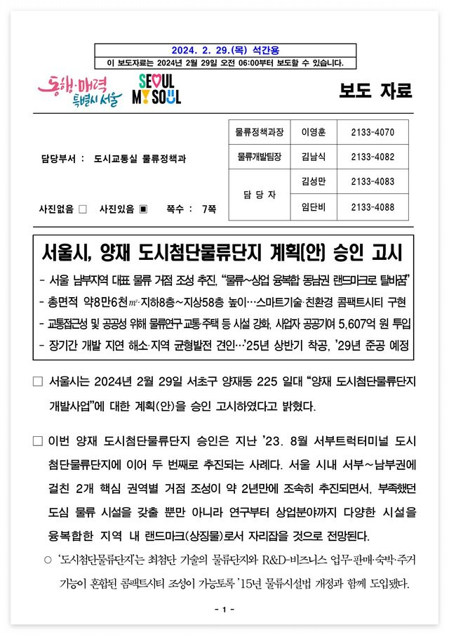 □ 제목 : 서울시, 양재 도시첨단물류단지 계획(안) 승인 고시