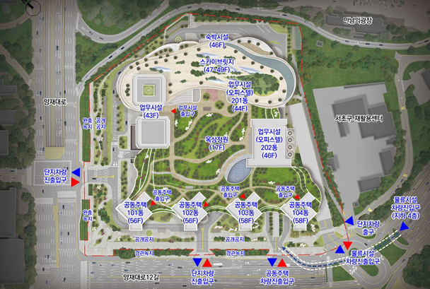 □ 도로 등 교통·물류 시설과 지역주민을 위한 주택·녹지 시설을 갖춰 공공성도 강화할 수 있도록 했다. 공공기여로는 ▲ R&D 관련 연구·업무시설(23,600㎡) 확충, ▲ 소셜믹스를 통한 공공임대주택(45세대) 공급, ▲ 경부간선도로 재구조화 사업비부담 및 신양재IC 상하행선 램프 신설, ▲ 서초구 재활용처리장 현대화 등 지역 기반시설 확충에 5,607억 원이 투입되어 지역 균형 발전을 실현할 계획이다.