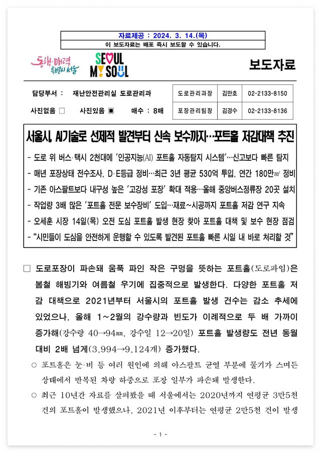 □ 자료 다운로드 : (자료제공) 서울시, AI기술로 선제적 발견부터 신속 보수까지…포트홀 저감대책 추진