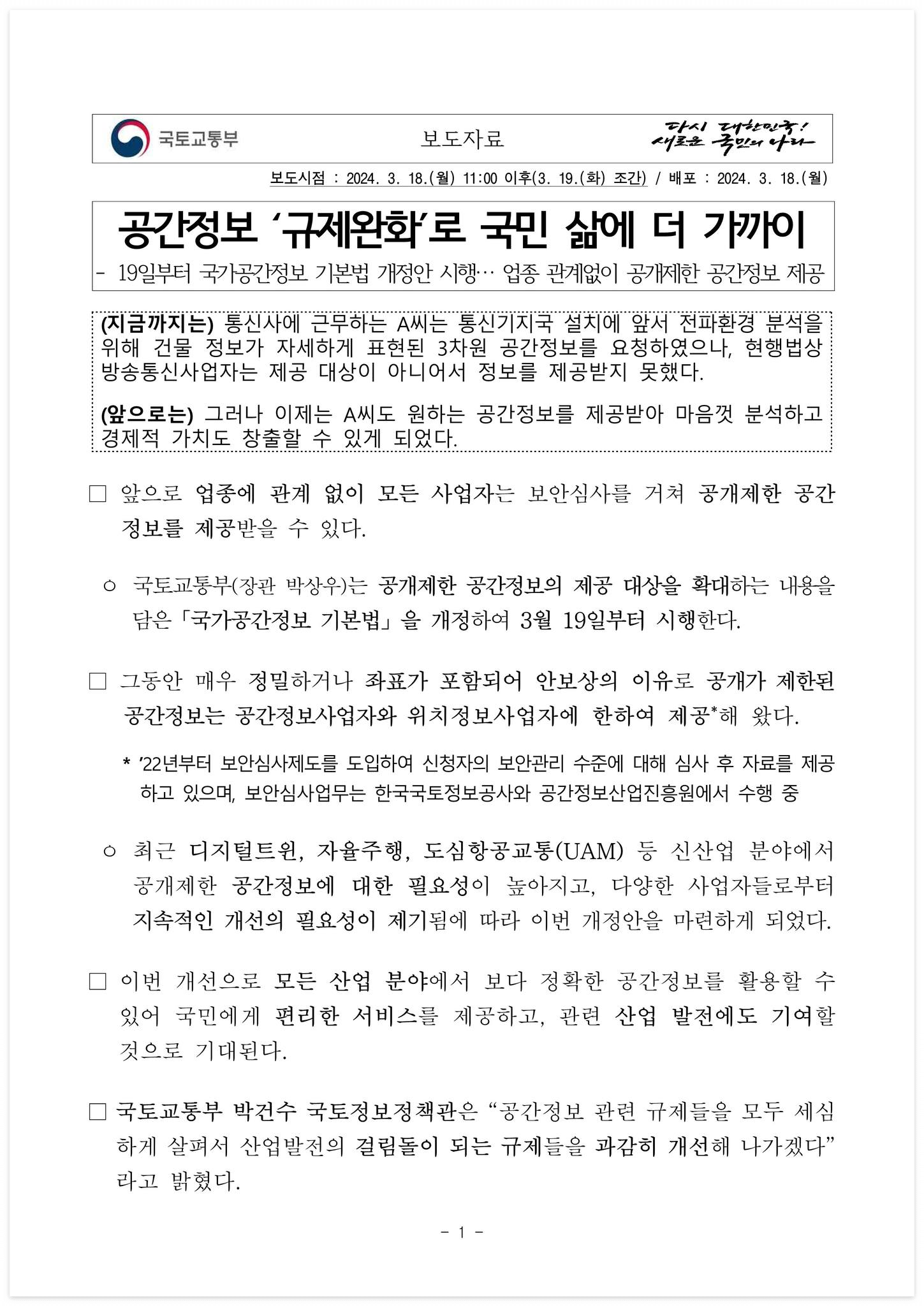 ㅇ 국토교통부(장관 박상우)는 공개제한 공간정보의 제공 대상을 확대하는 내용을 담은「국가공간정보 기본법」을 개정하여 3월 19일부터 시행한다.