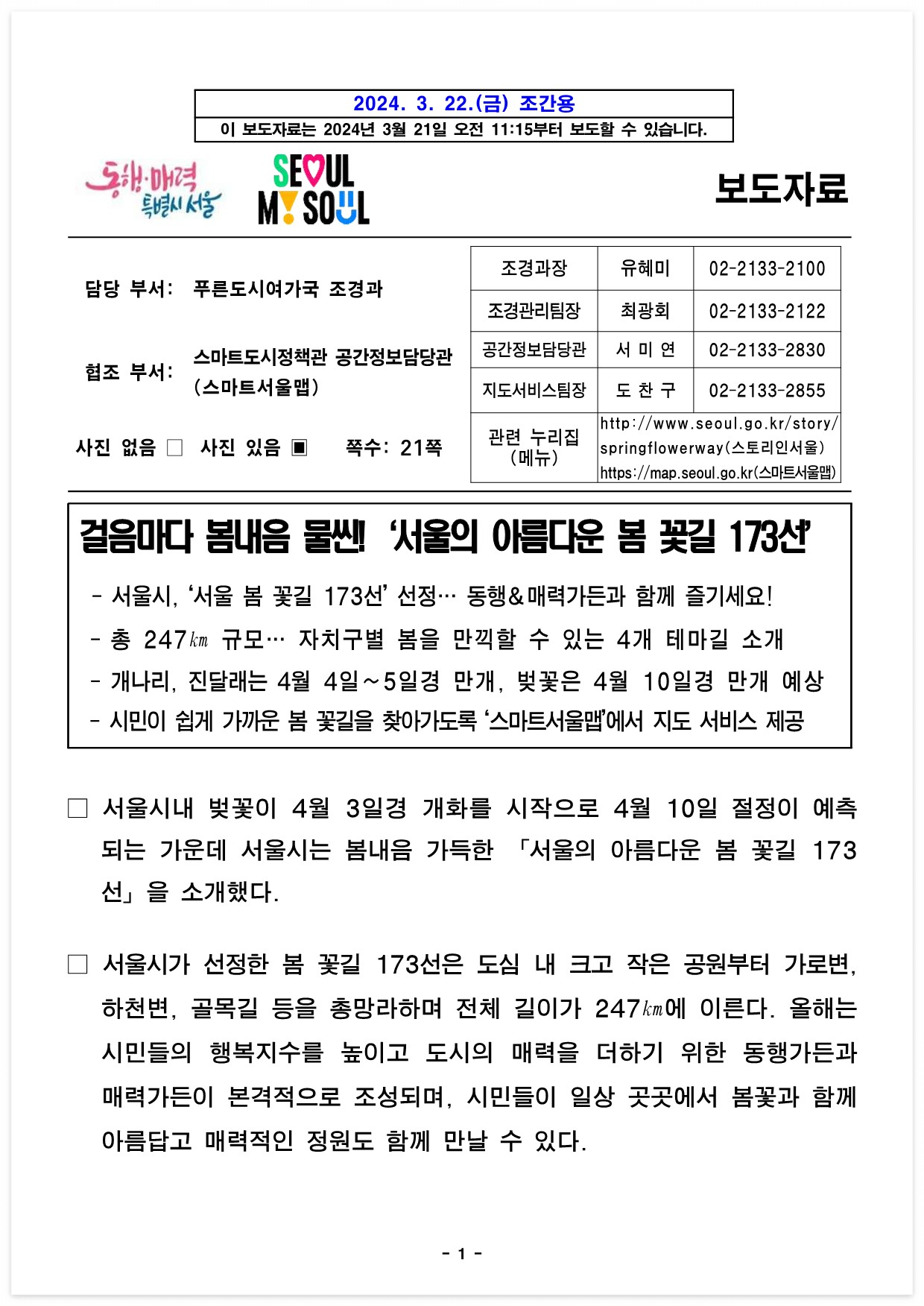 □ 자료 다운로드 : 걸음마다 봄내음 물씬! ‘서울의 아름다운 봄 꽃길 173선’