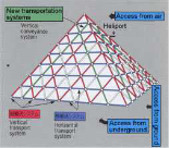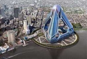 시미즈 주식회사의 또 다른 허무 맹랑하게 보이는 야심찬 사업이다. 도쿄의 75만 명의 주택을 수용할 수 있고, 이집트 가자지구의 피라미드보다 약 14배나 높은 2Km 높이, 3 마일 (약 4.8Km) 길이의 피라미드이다. 이 도시의 이름은 “공중 피라미드 도시 (Pyramid City in the Air)”다. 초거대 트러스 공법은 대량의 기초에 대한 필요성을 제거하면서 연성의 무제한 구조 배치를 가능케 한다. 기본 구조는 탄소 섬유의 축으로 구성된 정 8각형으로 조립된다. 거주 및 비거주 인구를 포함하여 100만 명의 인구를 예상하고 있으며 총 사업 면적은 2,500 ha이다. 동업하고 있는 Tyrell 주식회사에 영감을 받았으며, 경량의 탄소 섬유 피라미드는 연구소 시설, 쇼핑 센터, 개인 주택 및 식당들을 자랑하게 될 것이다. 사업체들과 주거지들은 태양열, 풍력, 그리고 해조류나 습지의 쓰레기까지도 전력으로 공급받게 될 것이다. 이 피라미드는 분명히 현재 개발 중이다. 따라서 보다 구체적인 공법과 토목 구조 관련 정보는 시미즈의 홈페이지를 참고하기 바란다.