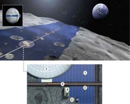 일본 시미즈 주식회사의 또 다른 하나의 훌륭한 아이디어이다. 엄청난 규모인 11,000 마일 (약 17,700 Km) 길이로 달의 적도를 따라 태양열 집적판 벨트를 설치하기 위한 마스터 플랜이 시미즈의 홈페이지에 올라와 있다. 달 위에 지어질 변전 시설은 전자파 형태로 지구에 저장된 에너지를 보내고, 전송된 에너지는 지구의 발전소에서 전기로 다시 변환하게 된다. 물이 없고 자전과 공전을 계속하는 달의 표면 둘레에 집적판이 설치되면 365일 24시간 내내 지구에서는 도저히 얻을 수 없을 정도의 엄청난 양의 전기 에너지를 생산할 수 있을 것이다. 다만 계획 단계지만, 시미즈의 달 고리가 방사선과 유성으로부터 심각한 손상을 받을 수 있고, 기술적으로 대량의 전자파가 환경과 생태계에 어떤 영향을 미칠지에 대해 아무도 확신하지 못한다. 하지만 달 둘레에 고리를 설치하겠다는 이 아이디어는 단순히 그냥 흘려 버리기에는 너무 신선하고 혁신적이며 도전할만한 사업이다.
