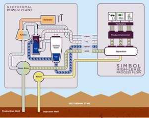 캘리포니아의 신생 기업인 Simbol Materials는 세상에서 가장 순수하고 가장 비용이 낮은 리튬을 잠재적으로 생산하는 지열 발전소에 의해 생산되는 소금물로부터 리튬, 아연 및 망간을 추출할 수 있다고 믿는다. 리튬 배터리의 수요가 급증함에 따라, 이것은 모든 수요를 충족시키는 가장 깨끗하고 가장 잠재적으로 이윤이 높은 방법일 수 있다. 이 회사는 이미 분당 20 갤런 (20gpm=0.076㎥/min)을 걸러내는 발전소를 가지고 있다. 그리고 솔턴호 (Salton Sea) 인근에 2012년 완공될 상업적 발전소는 연간 16,000 톤의 탄산 리튬을 생산할 수 있는 용량을 갖출 것이다.