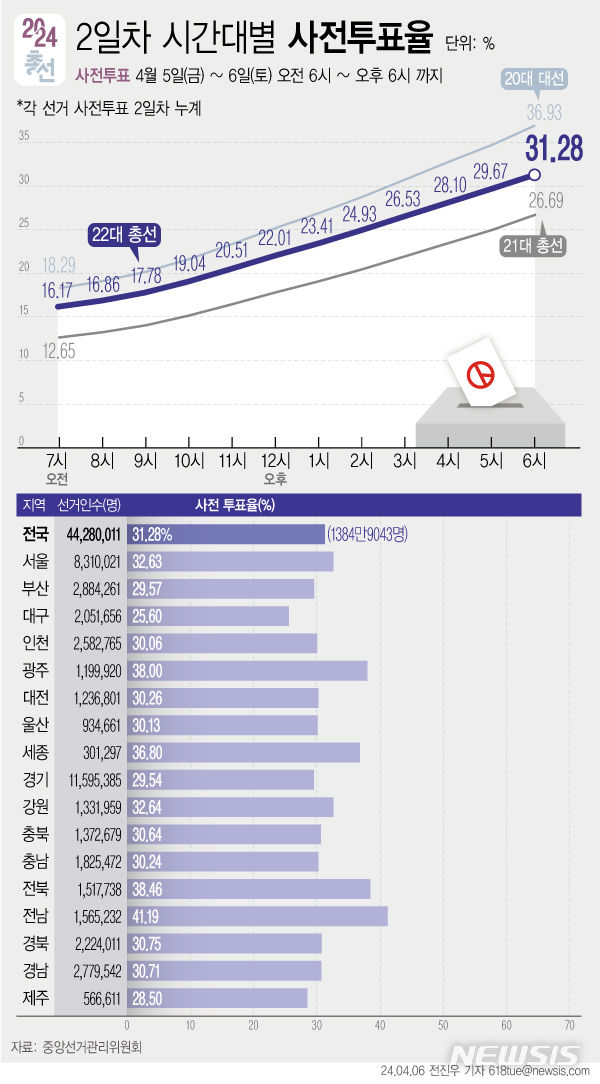 아래는 이번 2024년 22대 총선의 사전 투표 결과입니다.