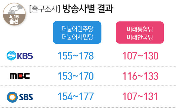 이번에는 2016년에 있었던 20대 국회의원 총선의 방송사별 출구조사 결과입니다.