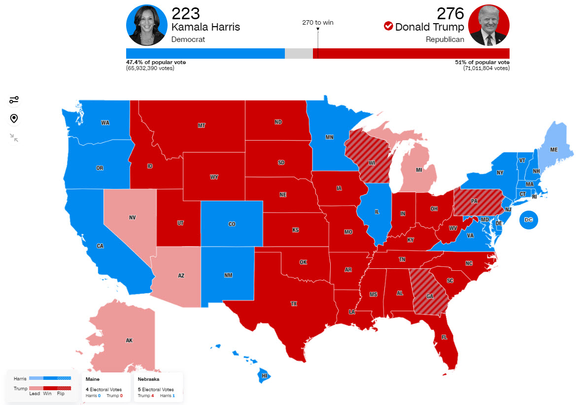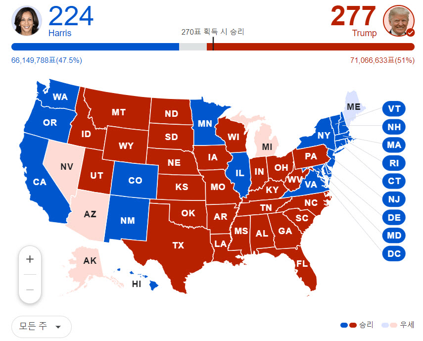 연합통신(AP)의 기준으로 보면 선거인단 270명을 확보해야 하는데 도널드 트럼프 (Donald Trump)가 277명으로 과반 이상을 획득했고, 224명을 획득한 캐멀라 해리스 (Kamala Harris)를 여유있게 따돌리고 대통령에 당선되었습니다. 득표수로 봐도 트럼프가 71백만표, 해리스가 66백만표로 51%대 47.5%로 크게 이겼습니다.