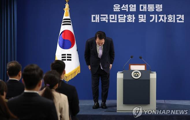 (서울=연합뉴스) 진성철 기자 = 윤석열 대통령이 7일 오전 서울 용산 대통령실 청사 브리핑실에서 열린 '대국민담화 및 기자회견'에서 국민들에게 사과하며 고개 숙여 인사하고 있다. 2024.11.7 zjin@