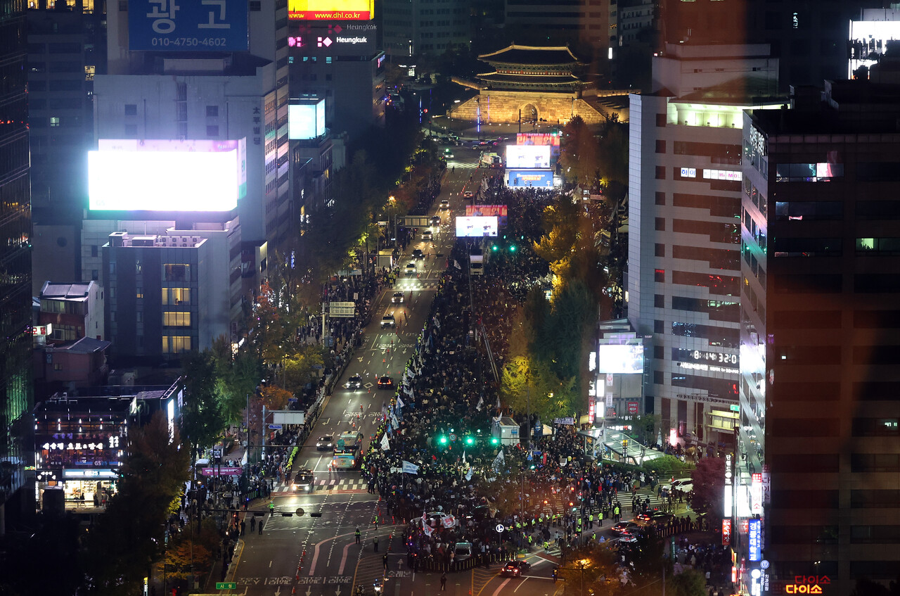[서울=뉴시스] 오정우 기자 = 경찰은 9일 서울 세종대로 일대에서 윤석열 대통령 퇴진 집회를 벌인 전국민주노동조합총연맹(민주노총) 등 시민단체 참가자 10명을 체포했다.서울 남대문경찰서는