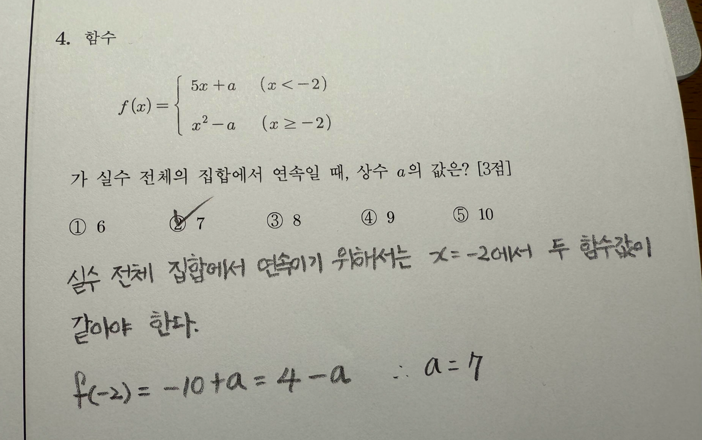 4번 문제는 함수 문제입니다. 그래프로 그리면 더 이해가 쉽지만 저는 그냥 쉽게 두 함수를 연립해서 풀었습니다. 두 함수가 실수 전체 집합에서 연속이기 위해서는 -2에서 두 그래프가 한 점에서 만나야 합니다. 이 부분만 이해하면 금방 이해됩니다.