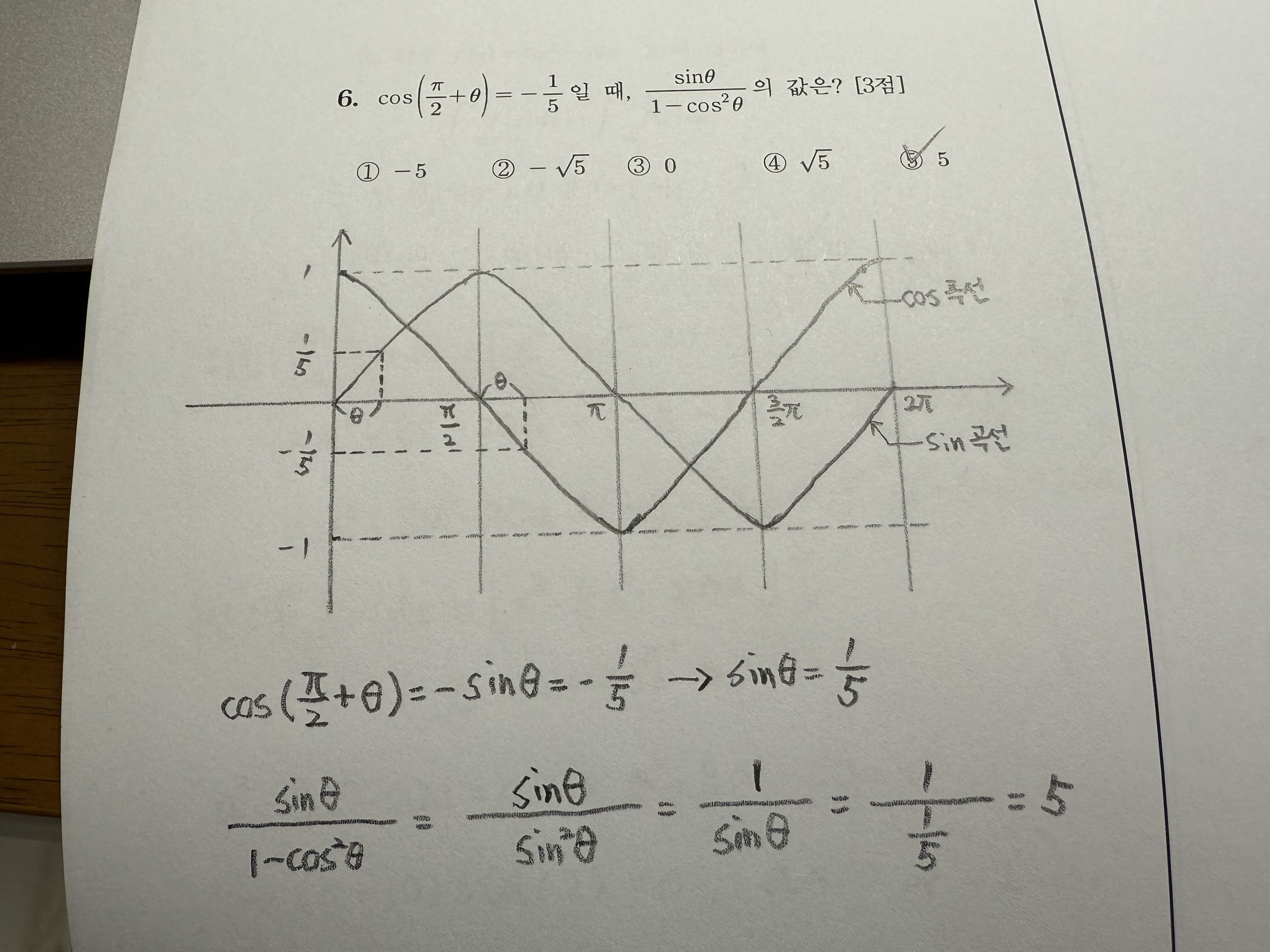 6번 문제는 삼각함수의 기본 성질을 이용한 문제입니다. cos 함수와 sin 함수의 변환에 대해 기억이 나지 않아서 그래프를 그려 확인해봤습니다. 공식을 단순히 외워서 기계적으로 풀지 마시고 저처럼 기본 이론과 성질을 알면 시간은 조금 더 걸리더라도 풀 수 있습니다. 문제를 풀고 보니 답이 또 5가 나왔네요. 6번 문제까지 답이 5인 문제가 세문제나 나오다니 그것도 희한하다는 생각을 했습니다.