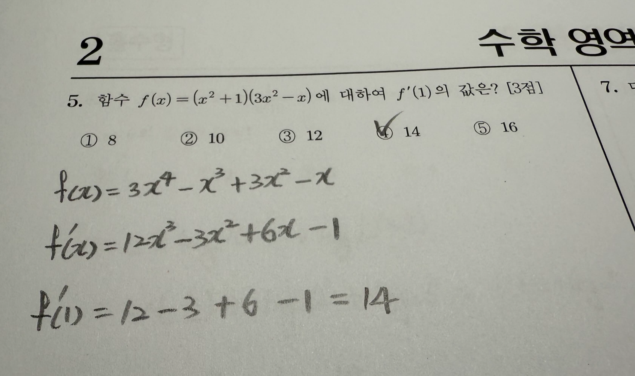 5번은 함수의 미분 문제입니다. 괄호 안으로 묶인 두 부분을 각각 미분하여 더하면 되지만 어차피 괄호를 풀어야 하므로 저는 처음부터 괄호를 풀고 시작했습니다. 미분의 기본적인 형태의 문제라서 많은 분들이 금방 풀었을 것이라고 생각합니다.