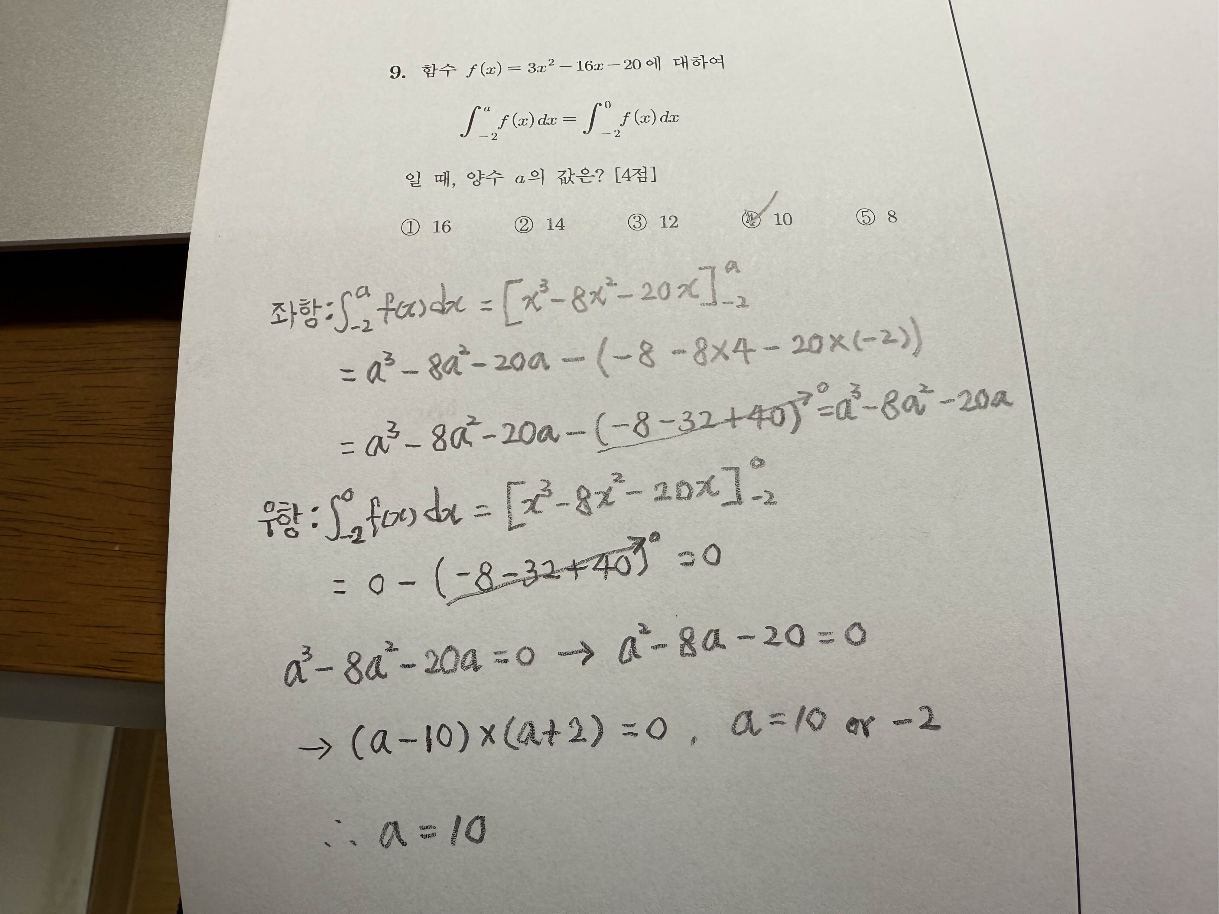답을 쓰기 전에 a>0 이기 때문에 10일 수밖에 없다고 써야 했는데 지금 보니 빠트렸네요. 완벽하게 풀고 싶었는데 이 부분은 아쉽습니다. 사진을 다시 찍기 귀찮아서 일단 블로그에서는 이렇게 마무리하지만 곧바로 추가해놨습니다. 나중에 손글씨 풀이 풀버전을 올릴 때는 고쳐져 있을 것입니다.