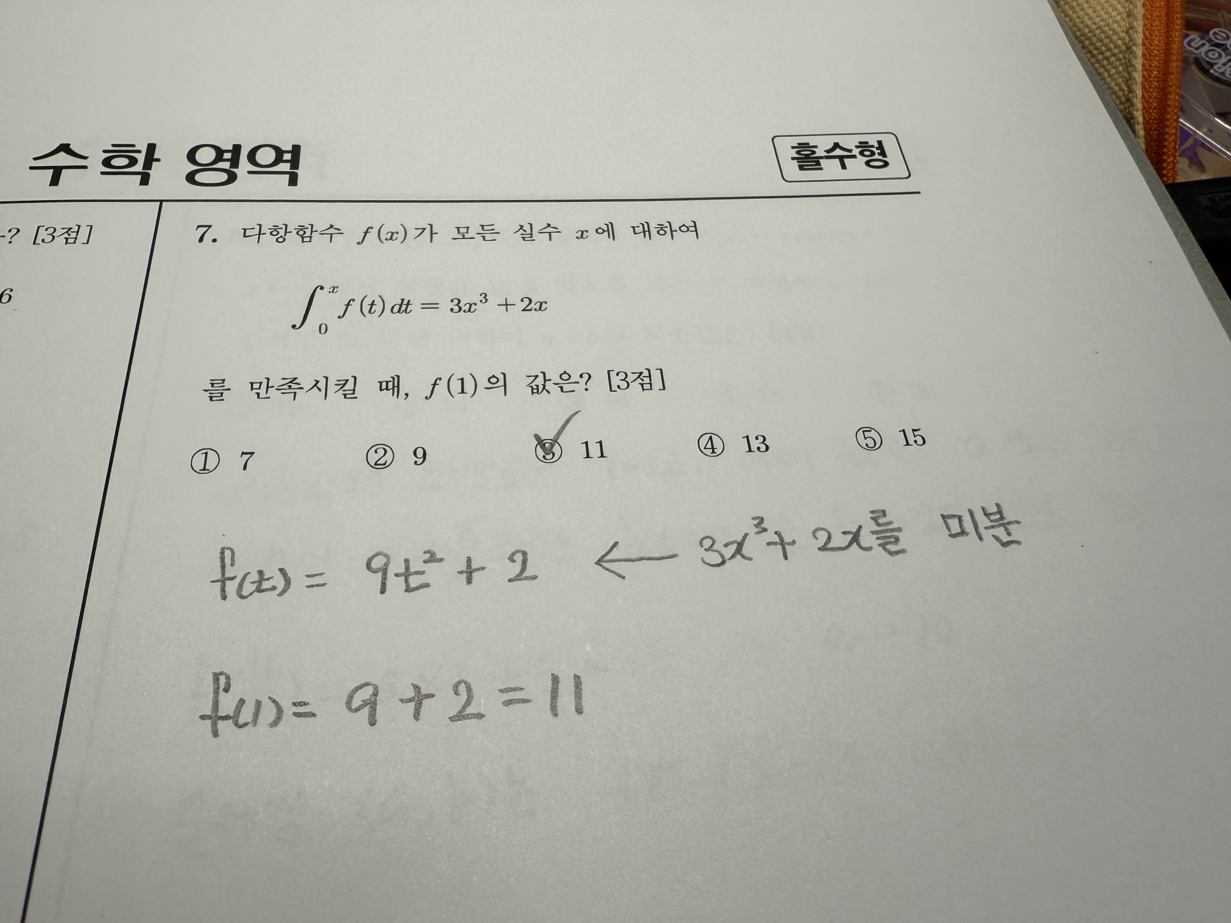 7번 문제는 f(x)를 t에 대하여 적분을 했더니 3x^3+2x가 나왔다고 했으니 반대로 미분하면 f(x)를 구할 수 있습니다. 괜히 t가 나오니 복잡해 보이고 어려워 보이도록 한 것뿐 기본만 알면 쉬운 문제입니다. 오히려 너무 쉬워서 내가 뭔가 착각했나 싶을 정도였습니다.