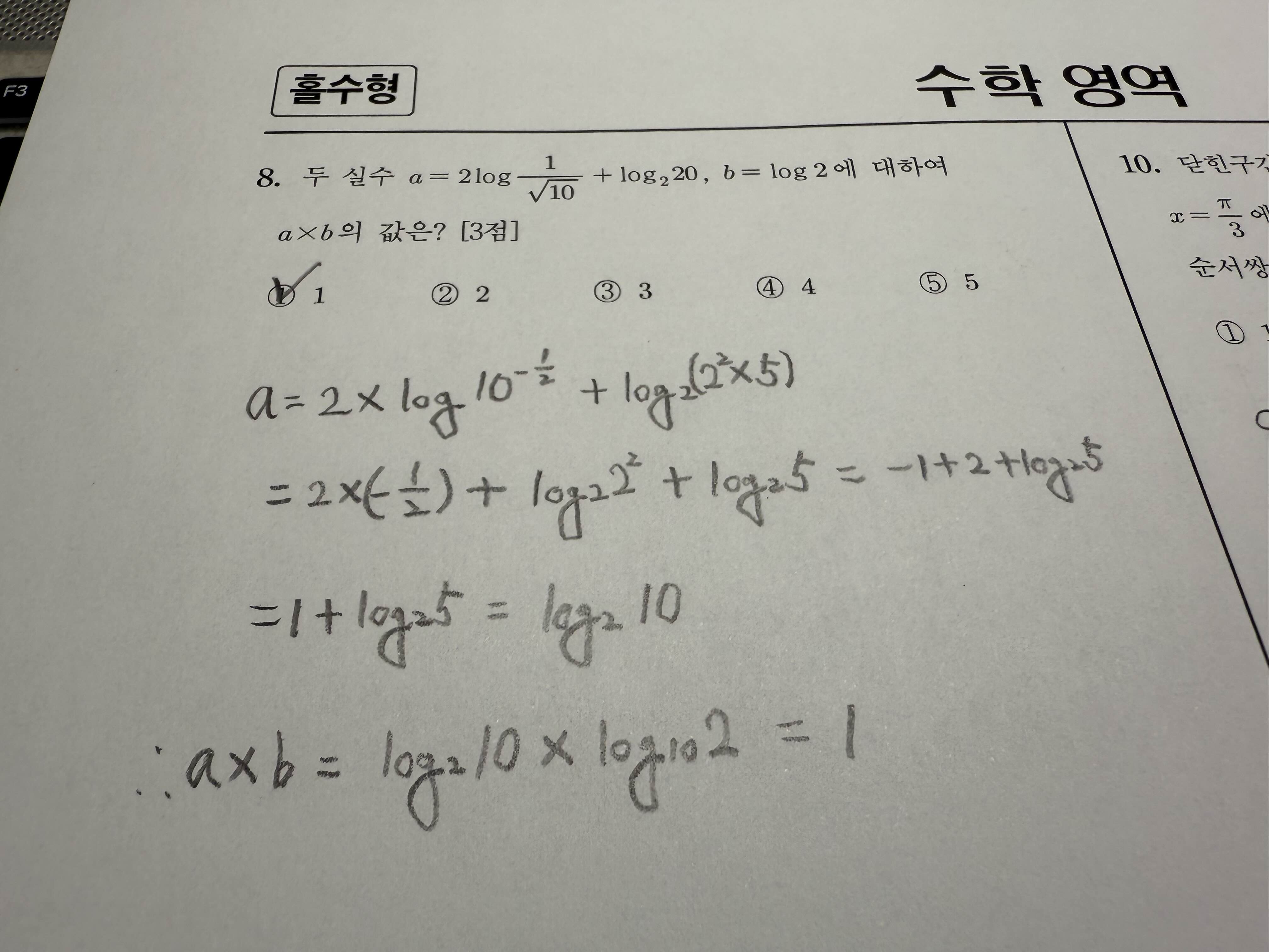 8번 문제는 로그의 기본 성질을 이용한 문제입니다. 루트 10을 분모로 하고 분수로 표현했을 뿐 로그의 기본 성질만 알고 있으면 너무 쉬운 문제입니다. 그리고 로그 안에서 곱하기는 로그 밖으로 빼서 더하기로 표현할 수 있다는 것을 알고 있어야 합니다. 마지막으로 밑이 서로 다른 로그가 서로 다른 진수를 갖고 있을 때 밑과 진수가 서로 교차하는 값을 갖게 되면, 곱할 경우 답은 1이 됩니다.