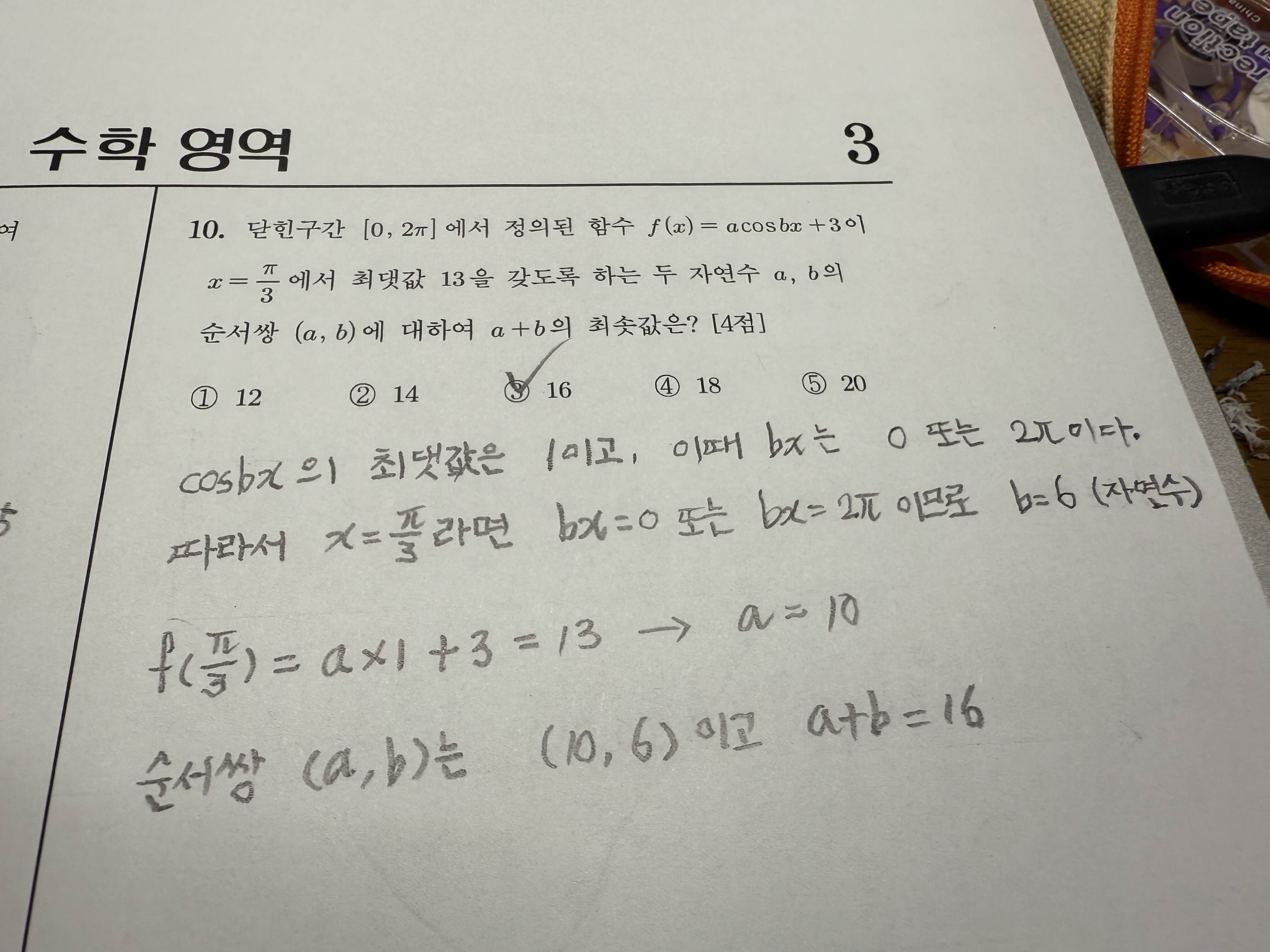 10번 문제는 삼각함수의 기본 성질을 묻는 문제입니다. cos과 sin 함수값은 제 아무리 곱하고 나눠도 1을 넘지 않습니다. 닫힌 구간이 [0, 2π]이므로 자연수 bx는 2π를 넘을 수 없습니다. 이것만 이해하면 나머지는 단순 산수 문제로 바뀝니다. 문제에서 순서쌍이 주어져서 마치 몇 개의 값을 가질 수 있는 것처럼 해놨지만 사실 한 가지밖에 값을 가질 수 없습니다. 즉, 정리하면 cosbx의 최댓값이 1이니까 f(x)의 최댓값이 13이라면 문제가 단순해진다는 얘기입니다.
