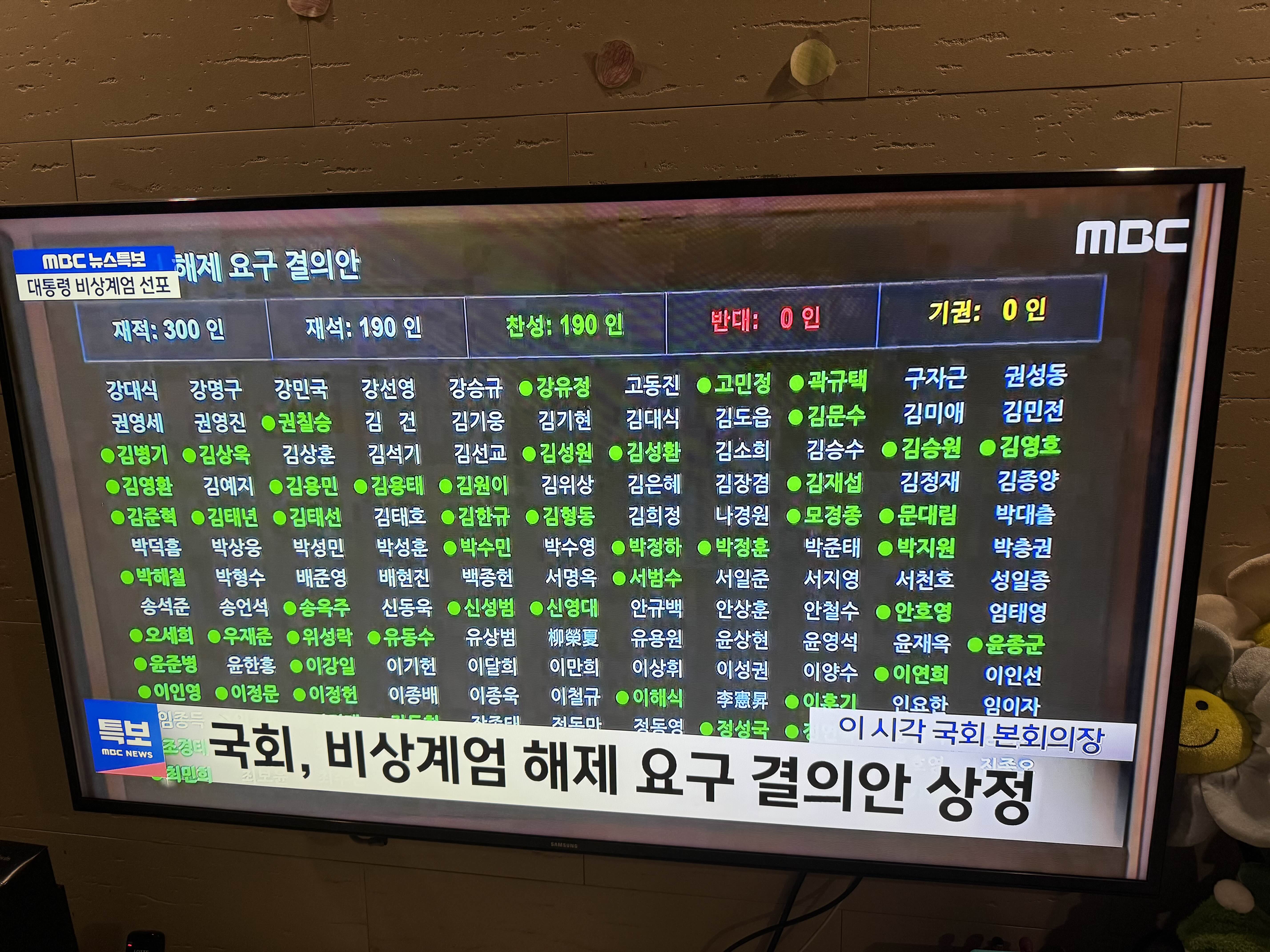 방금 새벽 1시쯤 국회에서 비상 계엄 해제 결의안이 190명 출석에 190명 찬성으로 통과 됐습니다.