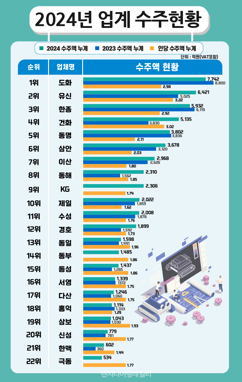 동명기술공단은 3,802억원으로 5위를 기록했다. 다만 동명은 전년 대비 수주가 -0.9% 하락했다. 인당수주액도 2억4,400만원→2억3,200만원으로 줄었다.