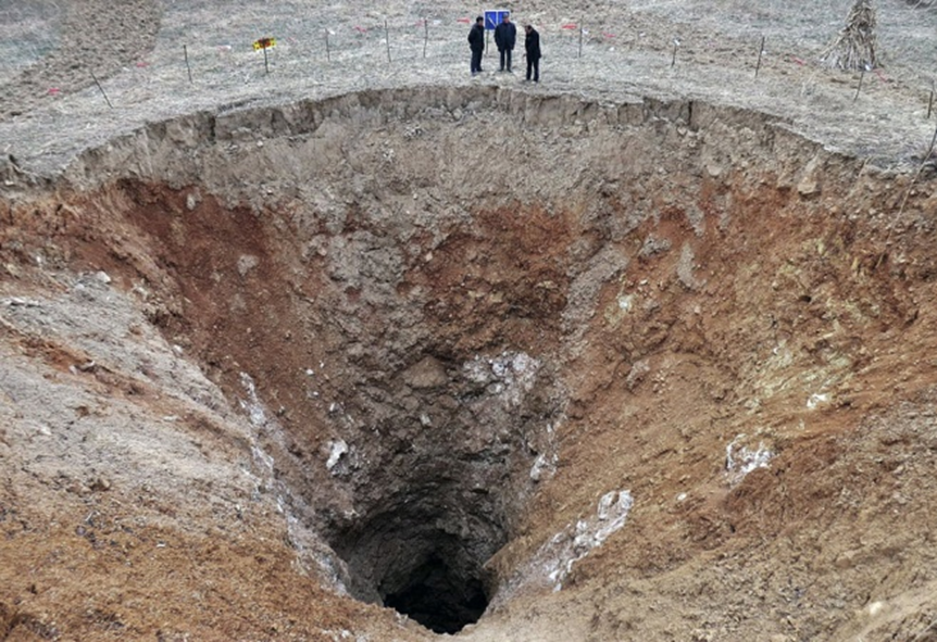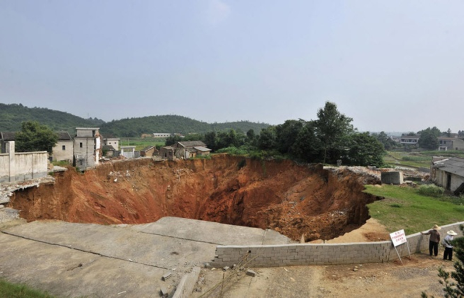 20. 2010년 6월 15일 중국 허난성에서 발생한 대규모 싱크홀. 직경 150m에 깊이가 50m나 되었습니다. 20채의 집들이 피해를 입었다. 지형적인 조건 때문이었다고 추측되나 정확한 원인은 밝혀지지 않았습니다.