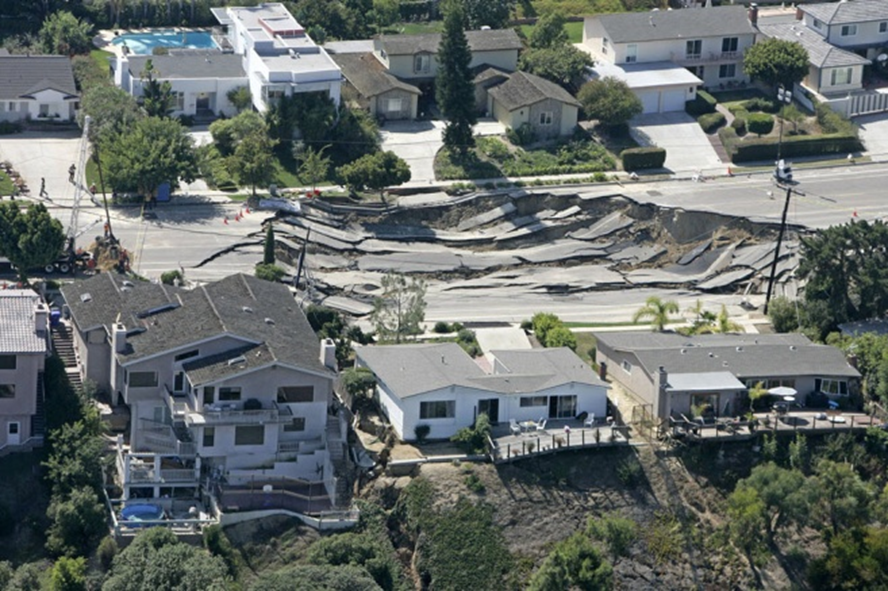 8. 2007년 10월 4일 미국 샌디에고에서 발생한 싱크홀. 언덕 근처 저지대가 붕괴된 것으로 인근에 위치한 집들이 피해를 입었습니다. 폭우가 원인인 것으로 알려져 있습니다.