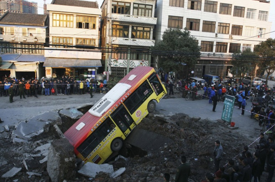 15. 2011년 1월 16일 중국 뤼안에서 발생한 싱크홀. 다행히 인명 피해는 없었고 지하에서 발생한 폭발 사고가 원인이었다고 합니다. 폭발의 원인은 알려지지 않고 있습니다.