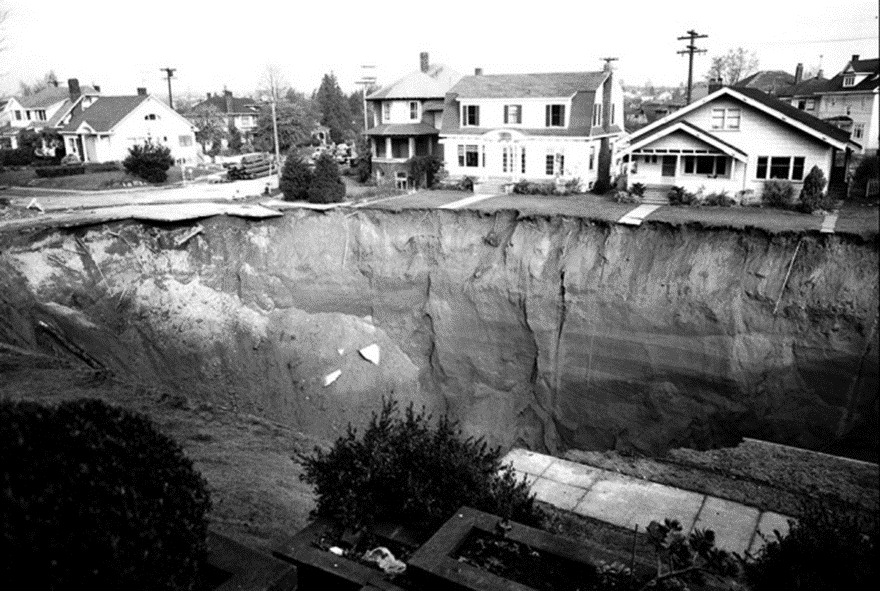3. 1957년 11월 11일 밤 미국 시애틀 라베나에서 발생한 싱크홀. 직경 1,800mm 오수관 파열로 인해 발생했으며 깊이가 약 18m였습니다. 천만 다행으로 인명피해는 없었지만 복구하는데 2년이나 걸렸다고 합니다.