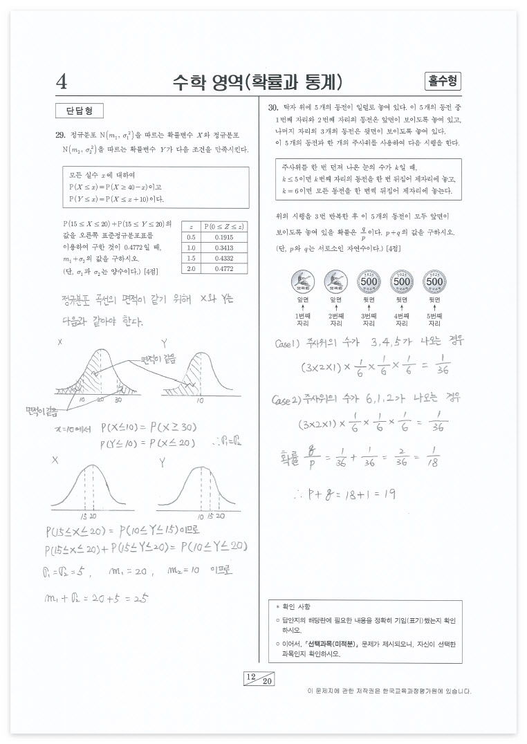 [엔지니어가 취미로 푸는 수학] 2024년 수능 수학 홀수형 확률과 통계 29번, 30번 문제 풀이