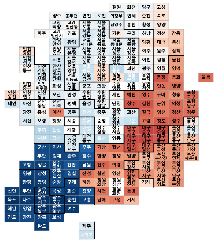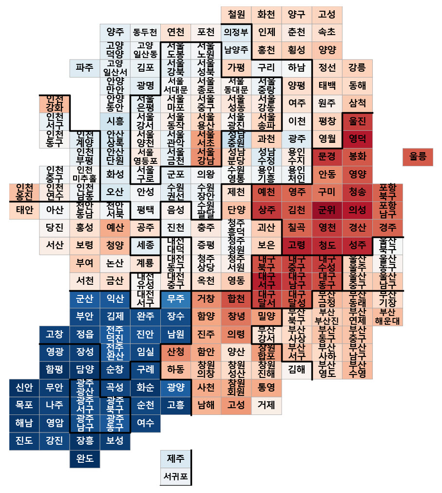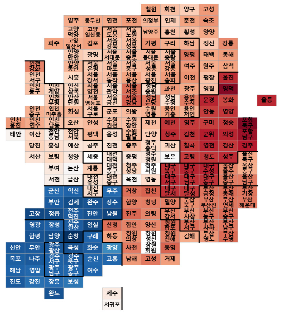 파이썬을 독학하기 위해 산 책에서 우연히 카토그램 (Cartogram)이라는 지도를 알게 되었고, 한국의 지도를 샘플로 제공하고 있었습니다.