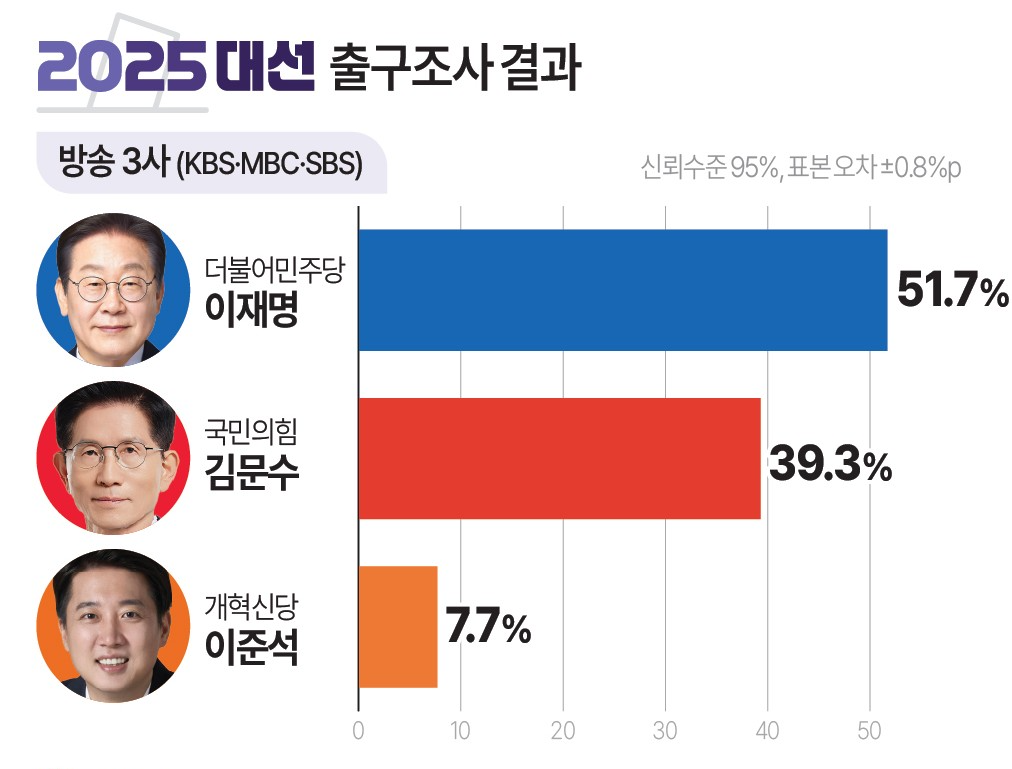 두둥!!! 긴 말 필요 없이 이번 2025년 21대 대선의 출구조사 결과를 아래와 같이 공유 합니다.