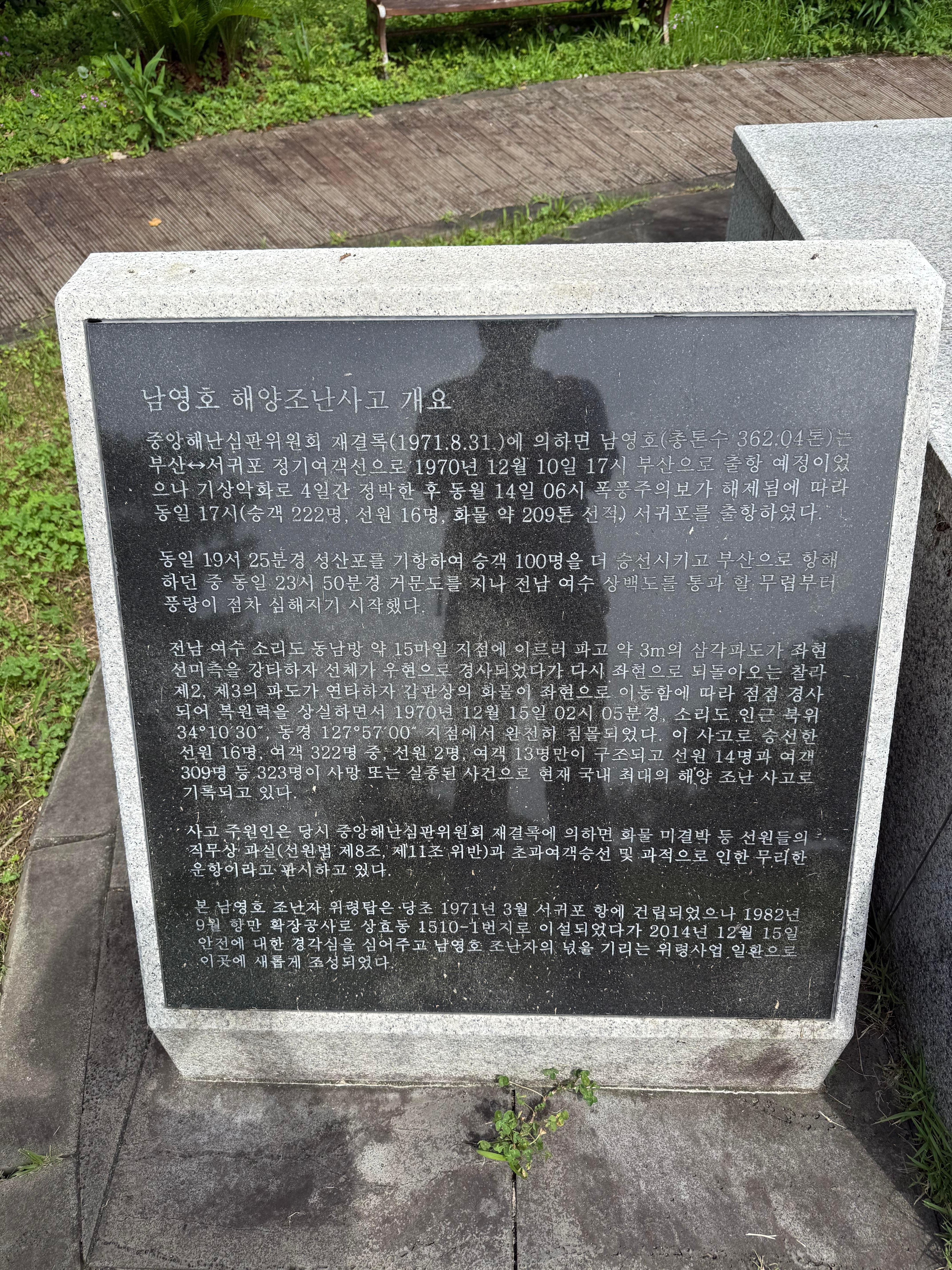 읽어보니 1970년에 323명이 조난사고로 사망했던 남영호의 대형 참사 희생자들을 위로하기 위한 위령탑이라 했다.