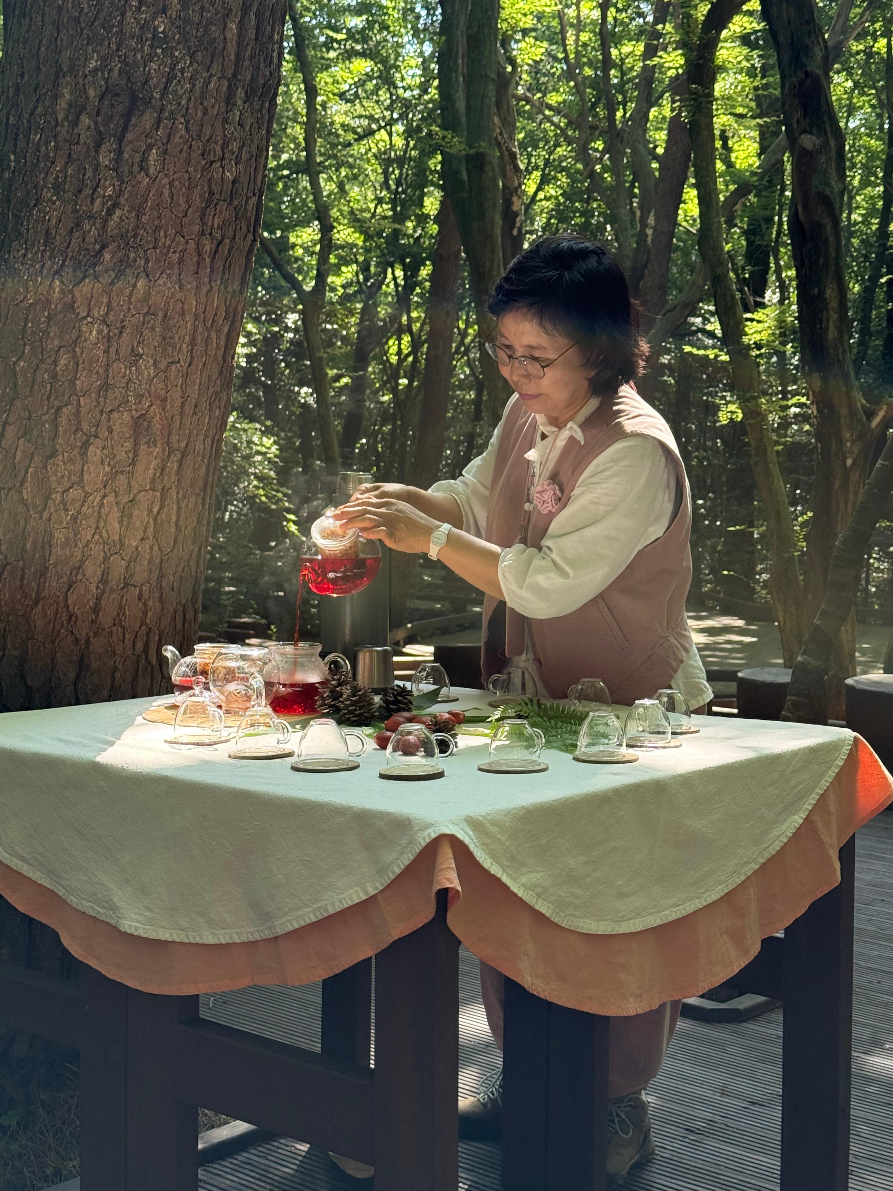 먼저 숲으로 가자마자 차 한잔씩 마셨다.