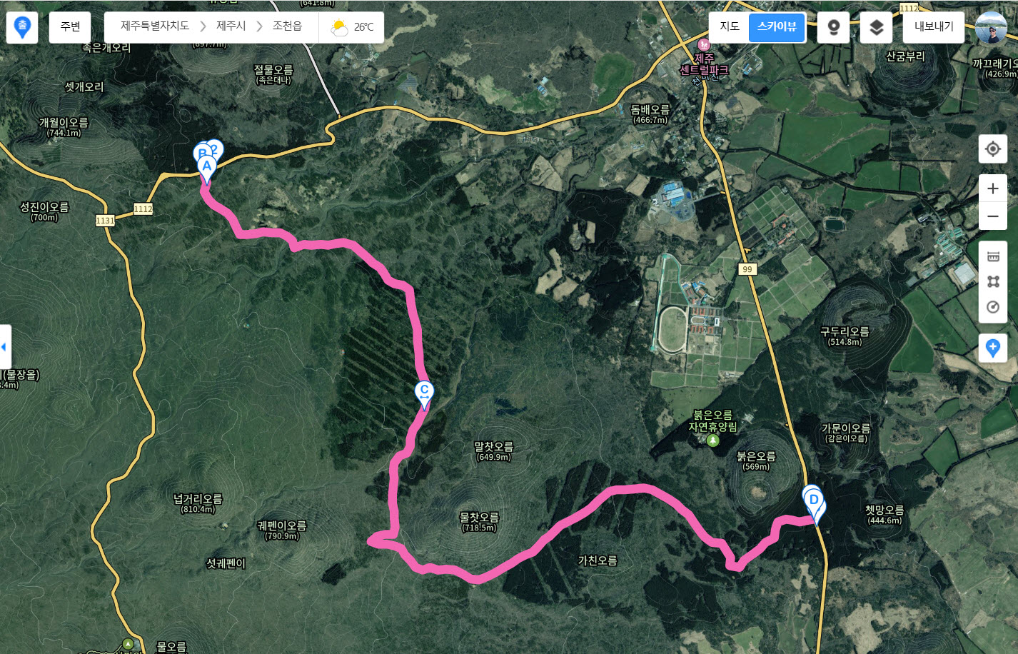 정확히 A 위치는 제주시이고 도로명이 '사려니로'이고, D 위치는 서귀포시고 도로명이 '남조로'이다.